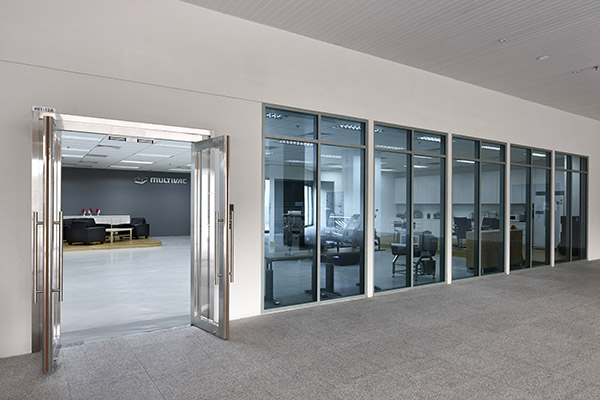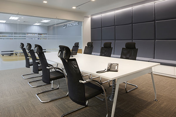 Designed in line with Multivac's strict color palette, the scheme of the wall and ceiling range from white to grey in harmony with the glass walls of the facade, adding a tint of timber shade on the vinyl raised floor at the lounge area. In the conference room, the padded graphite grey fabric wall and dark carpet floor contrast the smoother surface of the furniture and colored glass, creating an acoustically, visually and physically appealing effect.
