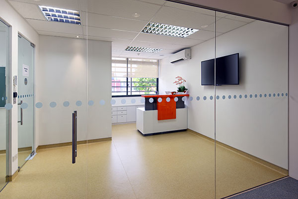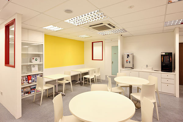 D’trax design an enclosure space of a large training room, where partitions erected with acoustic insulation are installed to allow audible communication. Blinds were installed along the windows panels, as it allows the flexibility of daylight to radiate into the space. Next to it, a cafeteria space, walls are painted white; space is furnished with trendy white polyurethane cafeteria furniture and custom-made cabinetry in matte white laminate to compliment the room. At the adjoining wall, the top part of the wall was painted in mustard and half glass window was constructed in timber frame spray painted in red color, to break the autonomy color in the cafeteria space. The space allows interaction between delegates and lecturer comfortably, as they break for catered lunch. Adjacent to the cafeteria, is a community wet pantry, served by wooden cabinetry laminated in sleek and high end high-gloss white laminate and dark blue.